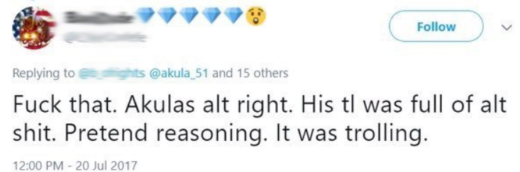 Chief Covfefe alt right Akula smudged Published February 1, 2018 at 733 × 243 in Chapter III: Life Beyond Mr. Wonderful – Exposing Twitter Trolls and Class-A A-holes « Previous Next »