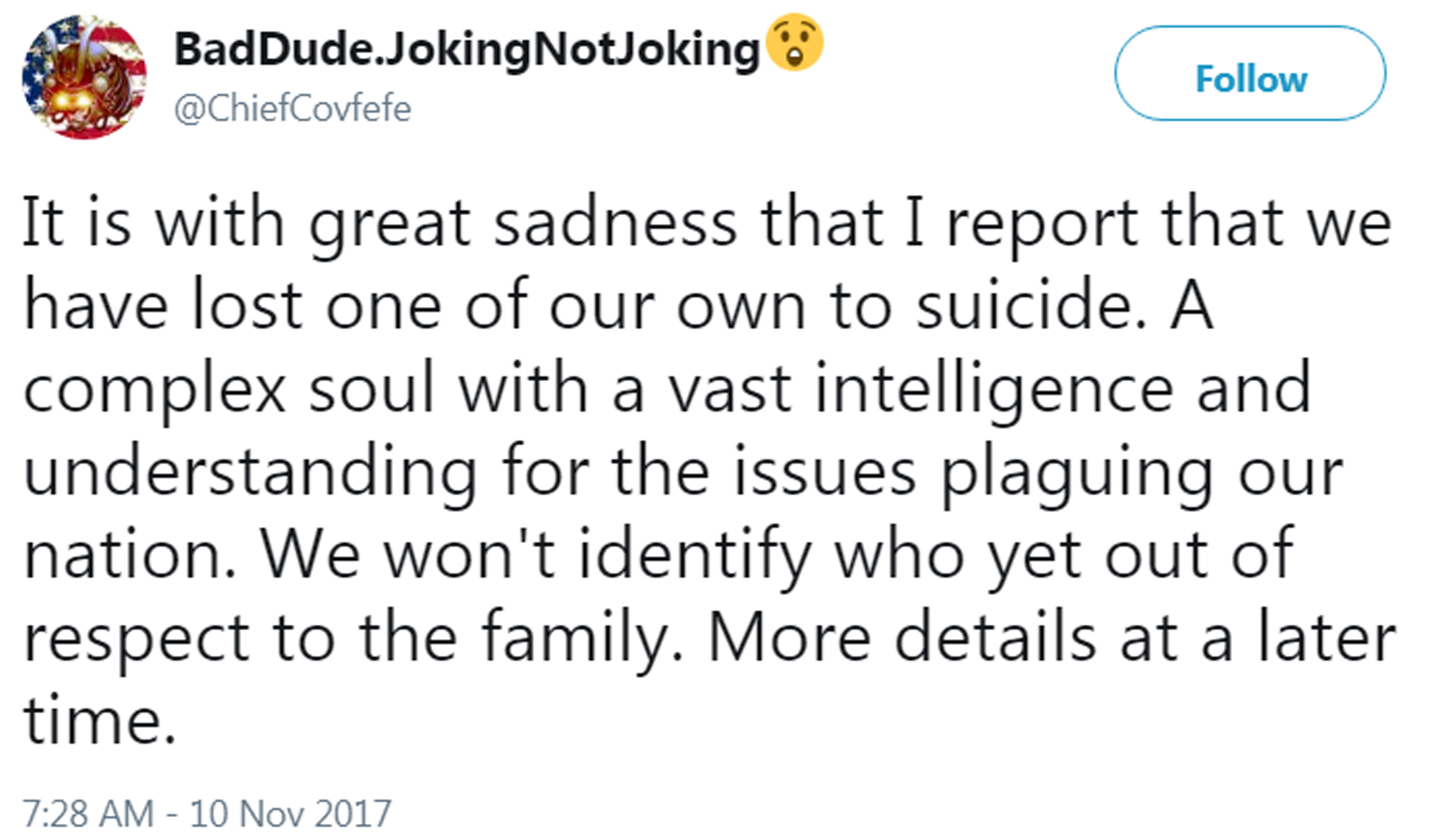Chief death announcement Published February 8, 2018 at 3000 × 1763 in Chapter III: Life Beyond Mr. Wonderful – Exposing Twitter Trolls and Class-A A-holes « Previous