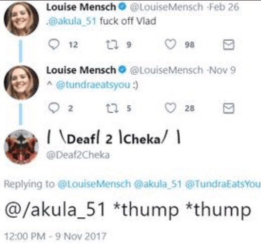 Louise Thump Thump Deaf2cheka tundra Published February 7, 2018 at 517 × 481 in Chapter III: Life Beyond Mr. Wonderful – Exposing Twitter Trolls and Class-A A-holes « Previous Next » The meaning of this can only be guessed at. Many suggest it’s a celebration. Others, a threat.