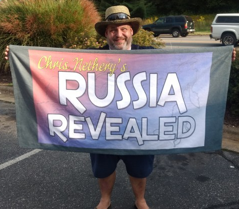 Rob Russia Revealed towel Published February 1, 2018 at 475 × 415 in Chapter III: Life Beyond Mr. Wonderful – Exposing Twitter Trolls and Class-A A-holes Next » Rob shows off his Chris Nethery’s Russia Revealed design on a beach towel in September 2017.